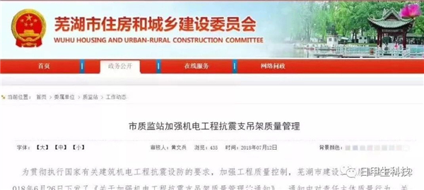 杭州市建设工程质量安全监督总站发出《关于加强建筑机电抗震支吊架质量管理的通知》。