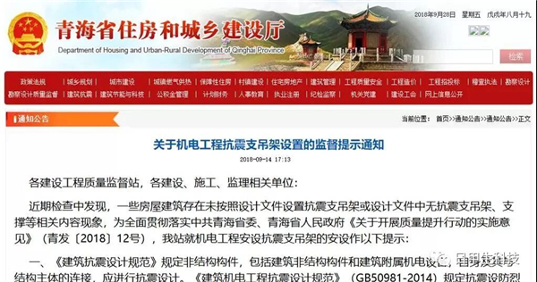 9月14日,青海省建设工程质量监督总站发出《关于机电工程抗震支吊架的监督提示通知》,对各建设、施工、监理相关单位明确提示——